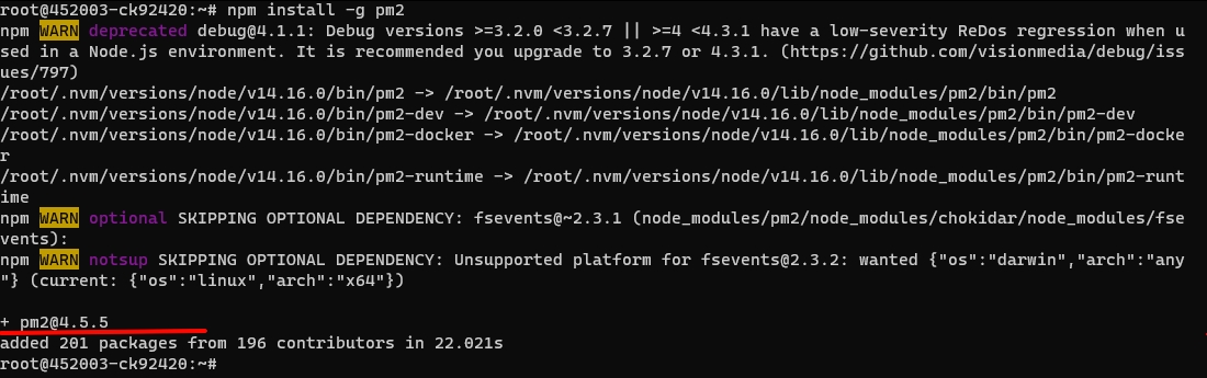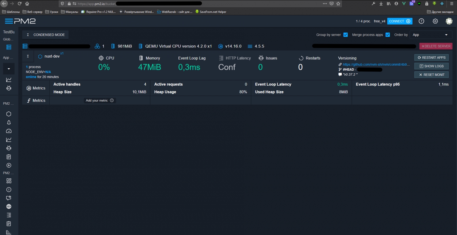 Для того, чтобы управлять процессами и приложениями, запущенными в среде Node.js, а также автоматического их запуска после перезагрузки сервера, нам понадобится менеджер процессов Node.js, который мы установим глобально в систему через пакетный менеджер npm. Пакет называется pm2: