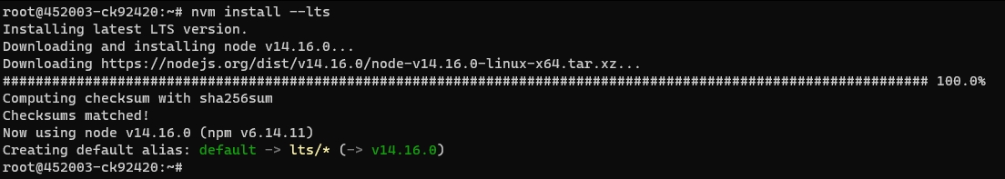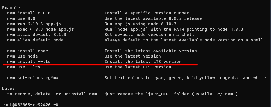 Запускаем команду nvm для того, чтобы посмотреть и ознакомится со списком команд скрипта. Находим команду установки NodeJS в версии LTS: