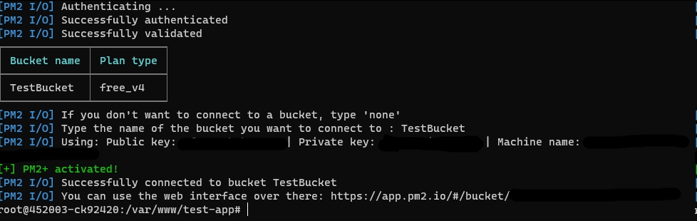 Если все введено верно, то pm2 попросит Вас выбрать, к какому Bucket подключиться - выбирайте ранее созданный. У меня это TestBucket