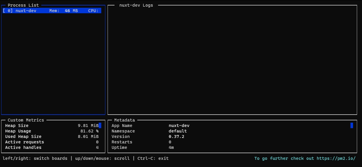 Для последующей остановки/запуска приложения не нужно будет заходить в папку с проектом и запускать командой выше. Достаточно будет ввести название приложения из монитора pm2: