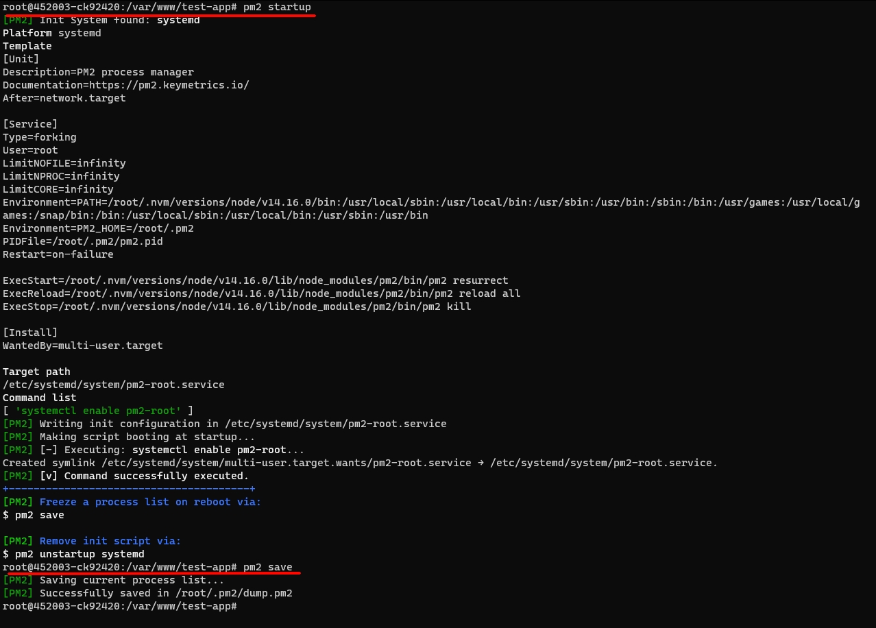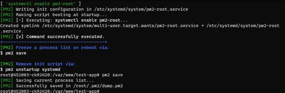 Подключаем автоматический запуск приложений через pm2 после перезагрузки сервера: