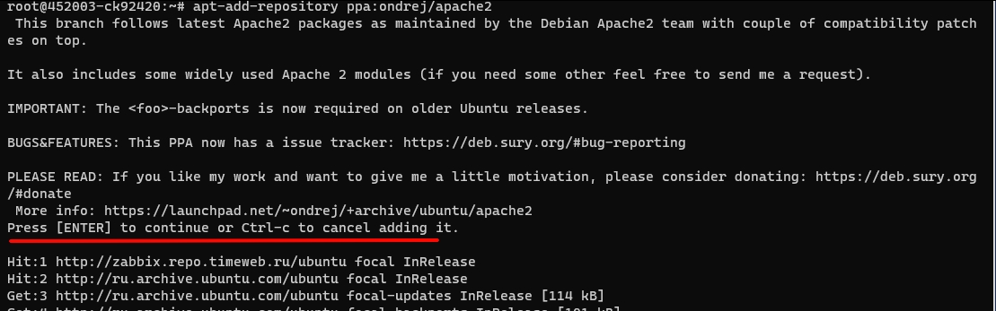 При добавлении репозитория, в терминале появится вопрос, на который необходимо нажать клавишу Enter: