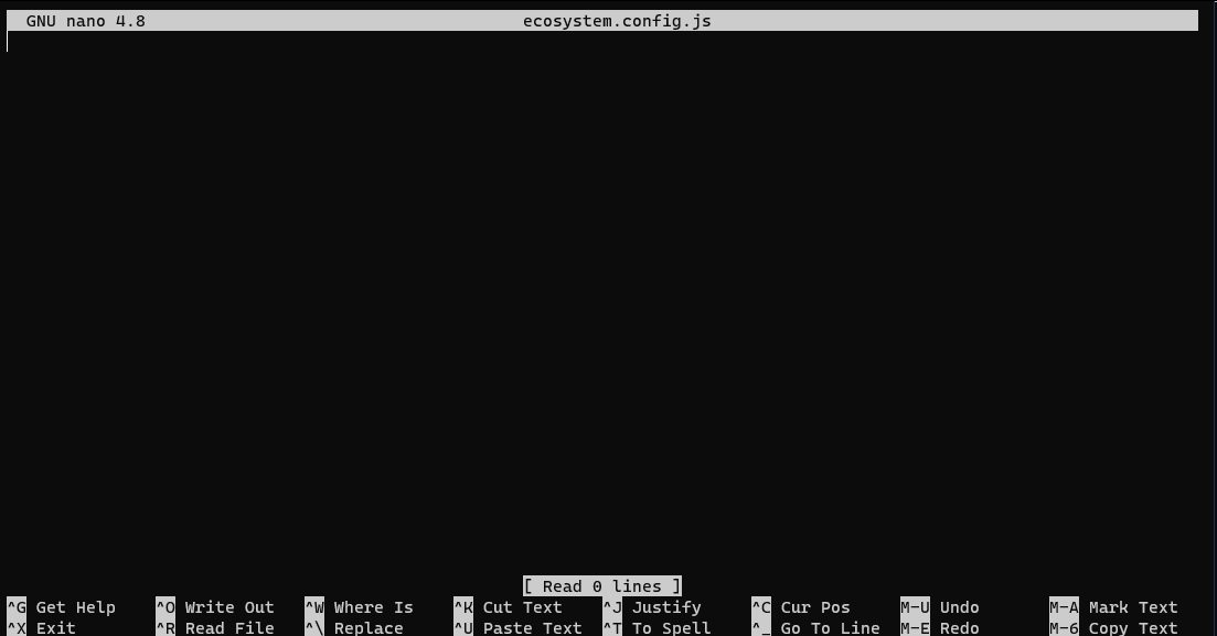 Открываем файл ecosystem.config.js прямо в терминале через редактор nano командой и удаляем все содержимое: