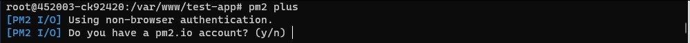 На первом этапе pm2 спросит, есть ли у Вас аккаунт pm2.io (в нашем случае есть и мы вводим букву y и жмем клавишу Enter