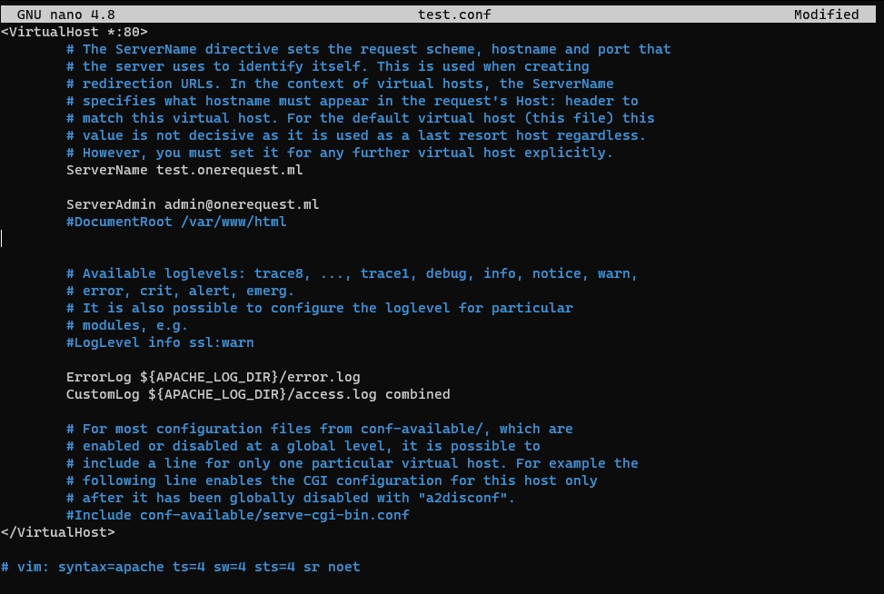 ServerName: необходимо раскомментировать и значение example.com поменять на ваше доменное имя