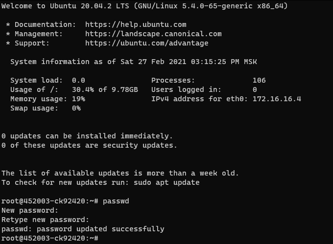 При успешном логине Вы увидите уже терминал (консоль) сервера: