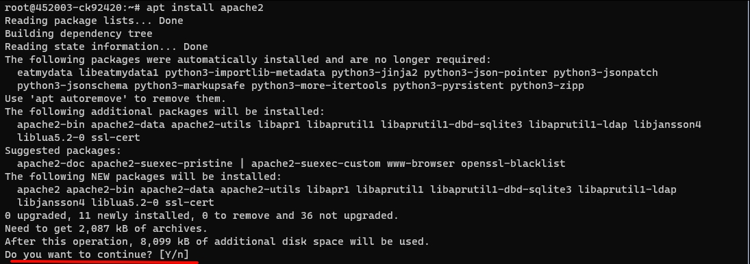 В терминале появится вопрос о подтверждении установки веб-сервера Apache2. Если согласны с установкой - смело нажимайте клавишу Enter.